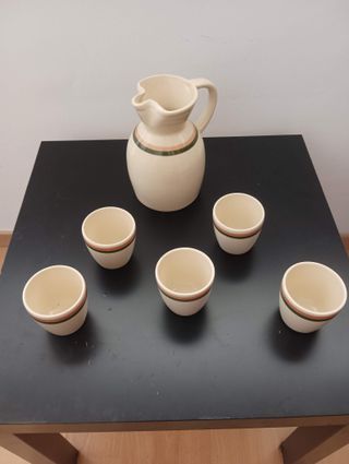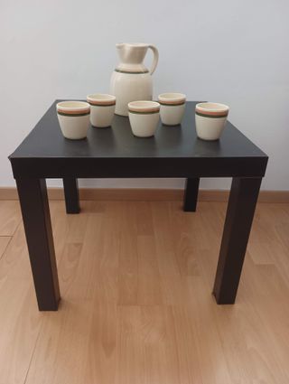 Conjunto de vajilla de cerámica de color beige con una jarra y cinco tazas sin desperfectos, regalo la mesa auxiliar negra de Ikea que tiene algunos desperfectos como se ve en las fotos. - Jarra de cerámica con detalles de rayas verdes y naranjas. - Seis tazas a juego con la jarra. - Mesa auxiliar de madera con acabado negro.