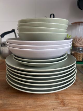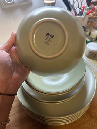 Conjunto de platos IKEA en color verde y gris, fabricados en ceramica. El set incluye varios platos y cuencos apilables. - Diseño moderno y funcional. - Apto para lavavajillas y microondas. - 4 bowls pequeños verde - 3 platos ondos gris - 2 platos planos pequeños verdes - 7 platos planos grande verdes Lo vendo a 30€ te quedan a 1,8€ cada pieza