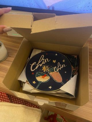 Conjunto de platos de postre con un diseño festivo y elegante. 6 platos - Decoración con copas de champán y estrellas. - Borde dorado. - Ideal para celebraciones.