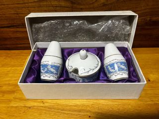 precioso Juego de porcelana fina inglesa para aderezos, salero, pimentero y mostacero Coalport.