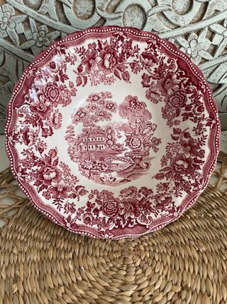 Preciosa fuente inglesa de Staffordshire con sello Myott. Presenta un diseño floral y paisajístico en tonos rojos. - Diseño floral y paisajístico. - Color rojo. - Sello Myott Staffordshire.