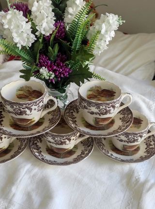 Precioso set vintage, (para merienda o desayuno), de la prestigiosa firma de porcelana inglesa SPODE, perteneciente a la colección "WOODLAND", con el número de serie impreso en la parte posterior. Tamaño desayuno o merienda, no es la taza pequeña de café.(Las medidas aparecen reflejadas en las fotografías). El conjunto está formado por 5 sets completos con su plato, si bien uno de ellos tiene el asa de la taza pegada.(Este detalle ha sido tenido en cuenta a la hora de contemplar el precio, pues la taza va de regalo solo cobro cuatro sets). Ref: 82A.