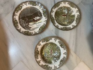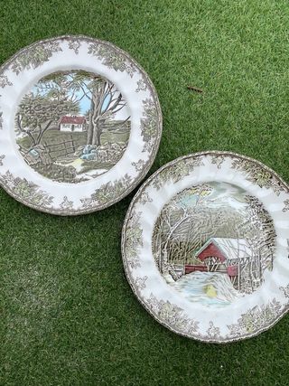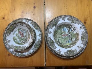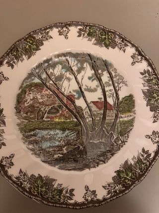 11 platos de porcelana inglesa de la marca Johnson Bros pertenecientes a la colección "The Friendly Village" con escenas campestres. Si se quiere pueden ir con soporte de resorte para colgar en la pared