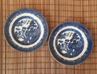 Conjunto de dos platos de postre en porcelana con el clásico diseño Blue Willow, marca Johnson Bros England. Diámetro: 18 cm. Artículo vintage, finales años 60 en perfecto estado de conservación, sin picado ni roturas. Los vendo también por separado a 12€ cada uno.
