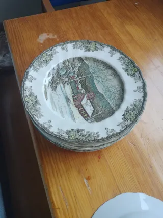 Vajilla colección "The Friendly Village" de Johnson Bros, 12 platos llanos de loza resistente, nuevos, pintados a mano, marca prestigiosa y proveedor de la Casa Real Británica, cada plato muestra escenas de pueblos idílicos. Dejaron de hacerse en 2003. Desde 1953 hasta 2003 fueron los años de fabricación y producción de estos preciosos platos. Hay fotos no subidas por falta de espacio, no duden en pedir mas detalle