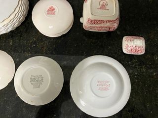 Vajilla inglesa de Johnson Bros, modelo Happy England 76 piezas: 22 platos llanos 12 platos hondos 12 platos de postre 10 consomeseras con plato 1 salsera 3 rabaneras 1 fuente redonda 2 fuentes ovaladas 2 boles grandes 1 sopera con tapa