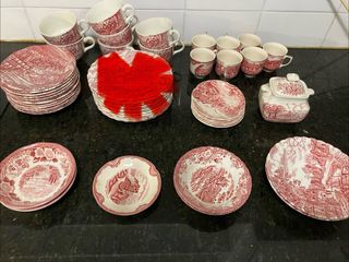 Conjunto de dos tazas con sus respectivos platos de la marca Johnson Bros. El diseño presenta un patrón de paisaje campestre en tonos rojos sobre fondo blanco. - Diseño clásico con detalles florales y escenas rurales. - Fabricadas en porcelana. No usadas ,siempre en vitrina.