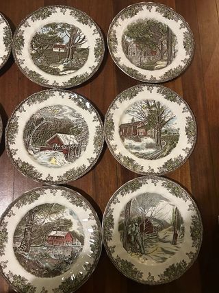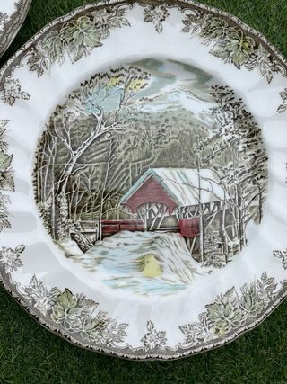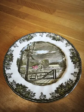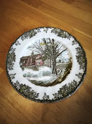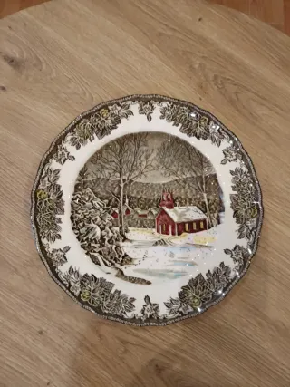 Preciosa vajilla de la marca Johnson Bros, con un diseño campestre, invierno. Son 12 platos, que nunca se han usado y en la caja original. Son de 27 cm de diámetro