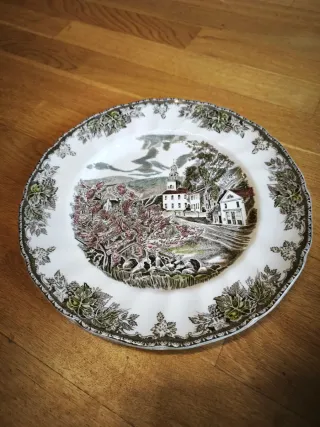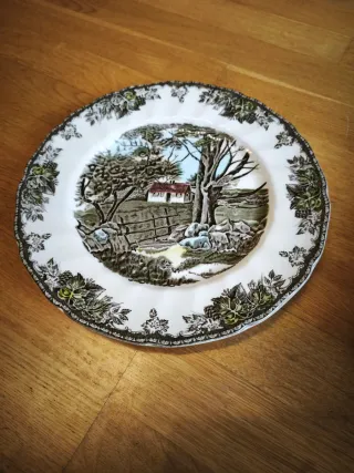 Plato decorativo de la colección The Friendly Village de Johnson Brothers. - Diseño campestre con escena detallada. - Borde decorado con motivos vegetales. - Pieza de cerámica con acabado esmaltado. - Se venden por unidad. - La vajilla completa consta de 12 platos. - Consultar precio por la vajilla al completo. - Hay 2 vajillas disponibles. - Recogida gratis en Lorca (Murcia). - Consultar precio de envío según destino.