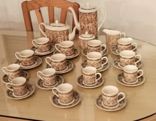 Elegante juego de café con un diseño clásico. 8 tazas, 12 platos, jarra para el café y azucarero - Piezas de porcelana con un intrincado patrón. - Tonos azules y blancos que aportan un toque de distinción.