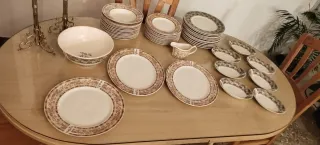 Servicio de mesa 12 platos llanos 28 cm 13 platos hondos 23 cm 11 platos de postre 23 cm 7 platos pequeños ovalados 19 cm 1 salsera 2 fuentes ovaladas 34 por 28 cm 1 ensaladera 30 cm 1 fuente redonda 31 cm Juego de te 1 tetera 1 azucarero 1 lechera 8 tazas de te 8 platos de te Juego de café 1 tetera 7 tazas de café 7 platos de café Todo sin estrenar Siempre guardado