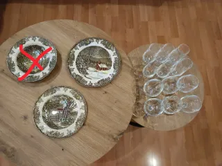 Conjunto de platos con diseño campestre y doce copas de cristal. - 12 platos llanos Johnson Bros 27cm, uno tiene un pequeño desconchado en el borde. - 12 platos medianos Johson Bros de 22cm. - Doce copas de cristal de Bohemia Claudia, en total, 6 copas Cava y 6 copas Vino.