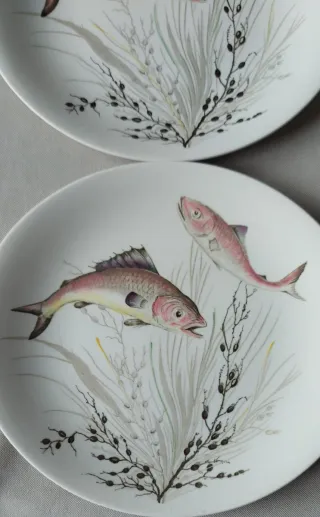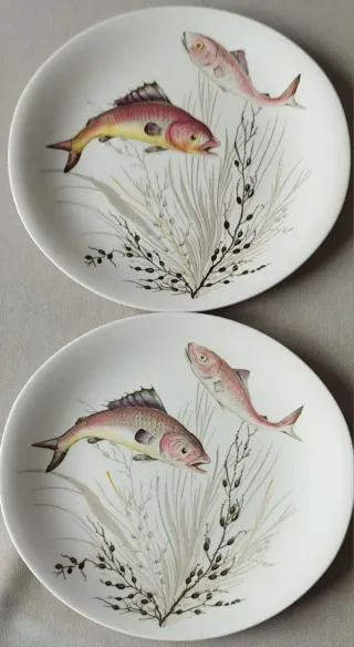 Conjunto de dos platos decorativos de Johnson Bros con un diseño de peces. Medidas: 25 cm x 26 cm - Diseño de peces en tonos rosados y amarillos. - Detalle de algas marinas y vegetación acuática. - Material de porcelana.