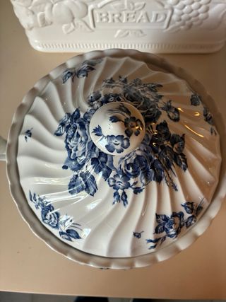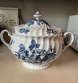Elegante sopera grande de Johnson Bros con un hermoso diseño de flores azules sobre fondo blanco. - Fabricada en porcelana. - Diseño clásico con asas. - Decoración floral detallada. - Nueva, sin estrenar