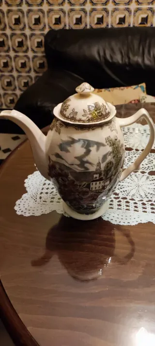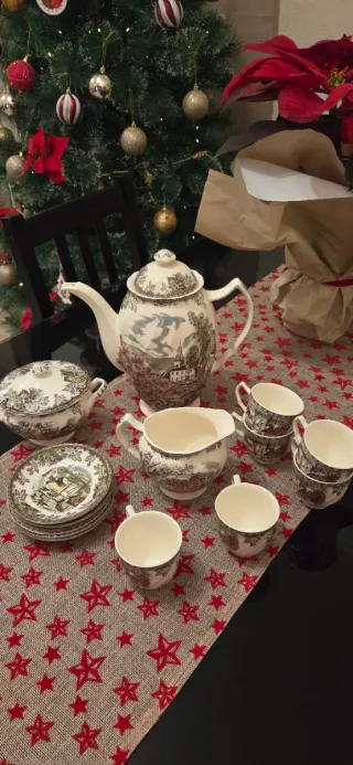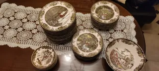 Conjunto de vajilla de Johnson Bros con un diseño campestre. Esta completa. 12 servicios. - Piezas de porcelana - 12 platos llanos, 12 platos hondos, 12 platos de postre y 13 bajoplatos - 1 sopera - 1 bandeja grande y una mediana - 1 tetera/cafetera, 1 azucarero 1 jarrita de leche - 12 juegos de tazita+platito - Decoración detallada con escenas rurales y motivos vegetales. - Tonos verdes y blancos predominantes.