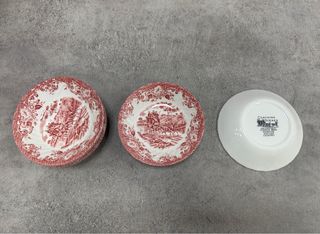 3 platos vintage de Johnson Bros (Made in England) con ilustraciones tipo transferware en color rojo. Modelos: Haddon Hall, Water Mill y Norris Castle. Diámetro: 10,5 cm Perfecto estado. Ideales para decoración, colección, cocina vintage o estilo cottagecore.