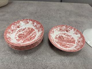 Conjunto de seis platos de porcelana inglesa de la marca Johnson Bros, con el diseño Coaching Scenes. - Diseño Coaching Scenes con escenas de carruajes. - Borde decorado en rojo. - Fabricados en porcelana. En perfecto estado, sin usar, sin rasguños Diámetro 13 cm