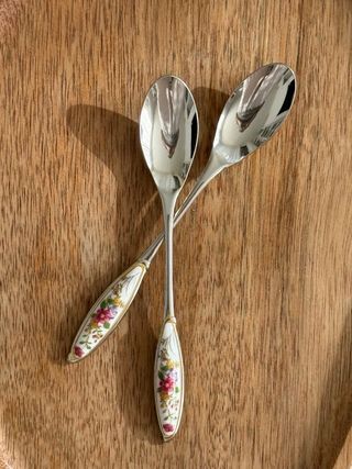 Dos cucharillas de café con detalles de cerámica, compradas en Japón. vintage decoración porcelana vajilla café té lechera cafetera art deco plato taza retro glamour salsera bandeja ensaladera postre cupcakes merienda cena desayuno plata oro antiguo antigua antigüedades coleccionista menaje set botella porcelana inglesa invitados Capodimonte Castro Capeans Iladró bidasoa Santa Clara Algora Limoges Sargadelos San Claudio Pontesa Sargadelos Johnson Bros Cartuja casa rural campiña provenzal atrezzo
