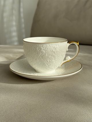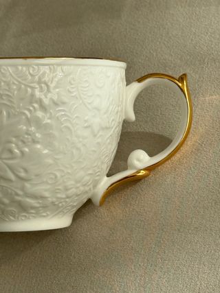 Elegante taza de porcelana con un diseño en relieve y detalles dorados. - Borde superior con acabado dorado. - Asa con detalles dorados. - Diseño floral en relieve. vintage decoración porcelana vajilla café té lechera cafetera art deco plato taza retro glamour salsera bandeja ensaladera postre cupcakes merienda cena desayuno plata oro antiguo antigua antigüedades coleccionista menaje set botella porcelana inglesa invitados Capodimonte Castro Capeans Iladró bidasoa Santa Clara Algora Limoges Sargadelos San Claudio Pontesa Sargadelos Johnson Bros Cartuja casa rural campiña provenzal atrezzo