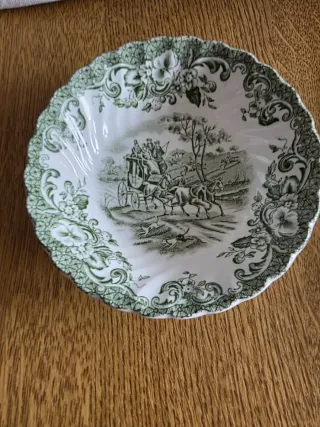 Precioso cuenco de Johnson Bros con un diseño clásico. Diámetro 13cm - Decoración detallada en verde sobre fondo blanco. - Borde festoneado y con relieve. - Escena campestre con carruaje.