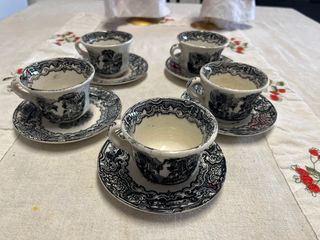 Conjunto de 5 tazas de café porcelana La Cartuja de Sevilla Pickman con sus platillos - Diseño detallado en blanco y negro. - Piezas de porcelana de alta calidad.