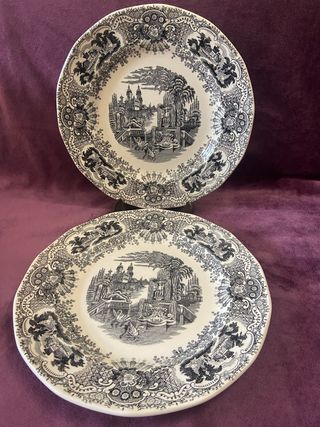 Conjunto de dos platos de cerámica con un diseño clásico. Con 24'5 cm de diámetro. - Diseño detallado en blanco y negro. - Borde decorado con motivos ornamentales. Sevilla Pickman Limoges nao Nadal lladró rosenthal vargas Segovia Macao villeroy boch vista Alegre churchill opaca mason's wedgwood molino viejo vintage retro mantelería cubertería vajilla tibor taza aguamanil china Japón
