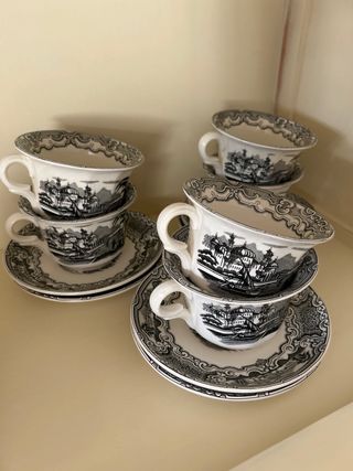 Conjunto de siete tazas antiguas y 4 platillos a juego, de la marca La Cartuja vistas negro .Presentan un diseño clásico de vistas en color negro sobre fondo blanco. -3 tazas de 9, 6 cm diámetro y 7 cm diametro, 3 tazas de 6,5 cm alto y 8,5 cm diámetro y 1 taza de 6 cm alto y 8 cm diámetro. - Diseño de vistas detallado. - Borde dorado. - Piezas de porcelana.