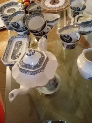 Conjunto de vajilla de la reconocida marca Cartuja de Sevilla, con un diseño clásico y elegante. - Piezas con motivos en blanco y negro. - Incluye: 24 platos llanos 12 platos hondos 12 platos pequeños 12 tazos con sus platos Salsera Tetera Lechera Bandejas de varios tamaños - Fabricada en cerámica y porcelana de alta calidad. Solamente hay un plato descascarillado y alguno con pequeñas manchas amarillas.