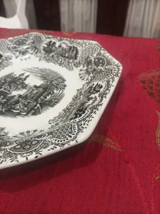 Preciosa fuente ensaladera ochavada de la marca La Cartuja Pickman Presenta un diseño clásico con un paisaje detallado en tonos negro y blanco - Diseño octogonal. - Decoración con motivos paisajísticos. - Borde decorado con motivos ornamentales.