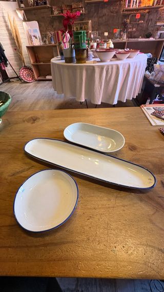 Lote de platos y fuentes esmaltadas en muy buen estado. Perfectos para cocina, decoración o restaurante. Estilo vintage / mediterráneo. El azul tengo dos piezas - Diseño orgánico y moderno. - Piezas únicas para tu mesa. A retirar en mi tienda del barrio gotico