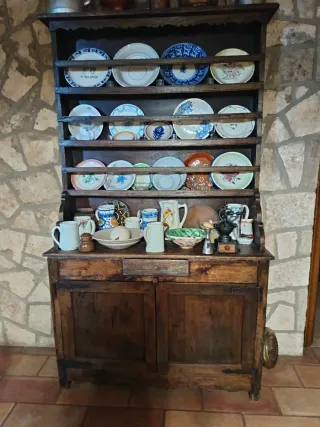 Mueble rústico bodega con vajilla y otros objetos