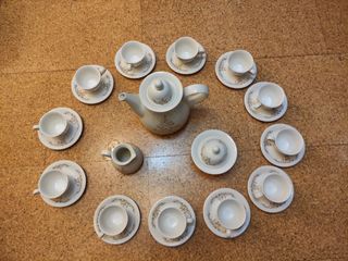 Juego de porcelana Pontesa Contiene Una cafetera, una lechera, una azucarera ( está pegada un asa), 12 tacitas de café y 11 platos Está muy bien cuidada, regalo de bodas del año 60 Te invito a visitar mi perfil, te puedes sorprender