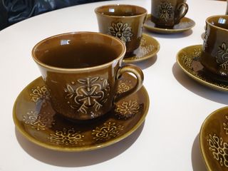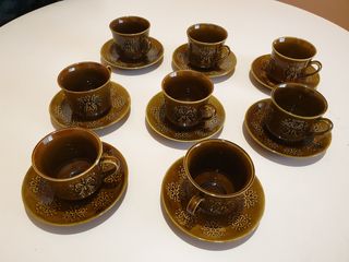 Elegante conjunto de tazas y platillos antiguos, años 70, de la conocida marca Pontesa. Once completos. Poco uso, por no decir ninguno. #vintage #antiguo #tazas #años60 #años70