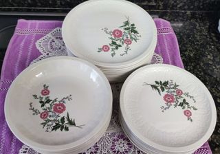 vajilla completa de 12 servicios 43 piezas cerámica española 12 platos llanos 12 platos hondos 12 platos postre 1 fuente grande 2 fuentes pequeñas 1 sopera con tapa 1 fuente honda 1 salsera con platillo Es antigua pero está en perfectas condiciones.
