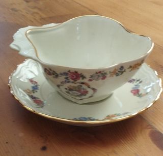 salsera vintage de porcelana alemana , segunda mano, ,dibujada con motivos florales y borde plateado, muy bien cuidado siempre guardada en vitrina y usada en contadas ocasiones, plato 16.5 diametro salsera 14.5 x 7 cms tengo mas vajillas en mi perfil, bidasoa, duralex, arcopal