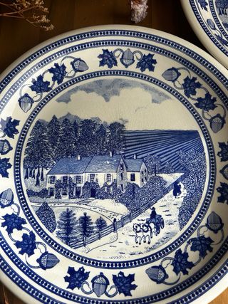 Conjunto de dos platos de porcelana inglesa con un diseño invernal. - Diseño de iglesia en la nieve. - Borde decorado con motivos vegetales en tonos marrones y verdes. - diámetro 27 cm. - cada plato 20€, los dos juntos 38€