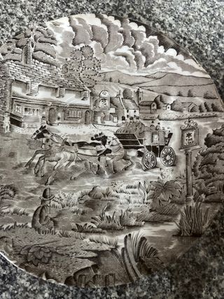 Conjunto de seis platos de postre antiguos con un diseño detallado. - Cada plato presenta una escena campestre con carruaje y posada. - El diseño es de estilo inglés, con detalles en sepia. - Ideales para coleccionistas o para añadir un toque vintage a la mesa.