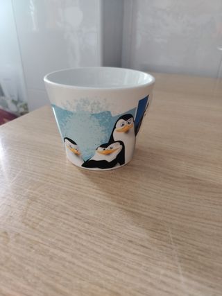 Taza de desayuno de porcelana con dibujos de los pingüinos de Madagascar. Ideales para el desayuno o cualquier momento del día. En perfecto estado. Capacidad 330 ml
