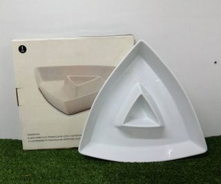 Se vende bandeja para entremeses triangular de porcelana con dos divisiones de la marca Happy Home. Las medidas son: 31x29x 5 cm. de alto. Nunca se ha usado y está en su caja. En mi perfil dispongo de más utensilios de menaje