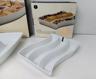 Vendo plato para entremeses rectangular con 3 divisiones de la marca Happy Home. Realizado con porcelana de color blanco. Medidas: 22x17x 4 cm. de alto. Está nuevo, sin estrenar. En mi perfil dispongo de más artículos de menaje y de decoración
