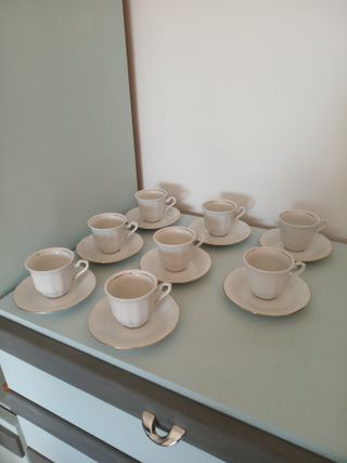 Juego de café de porcelana blanca de 6 piezas con detalle de flores. Cafetera, azucarero, lechera y 3 tazas con sus platos. Están en buenas condiciones menos algún que otro desgaste por el tiempo en alguna de las tazas. 2 platos adicionales de regalo.