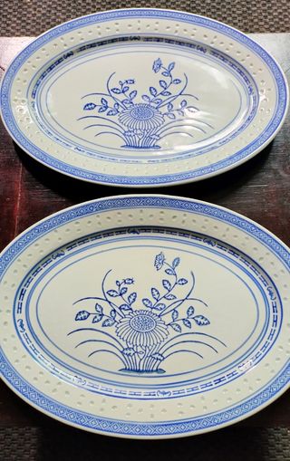 Se vende 2 Platos, Bandejas de porcelana China. Pintadas a mano. Bandejas nuevas, nunca usadas. 35 cm de largo. 25 cm de Ancho. No son bandejas recientes, + 35 Años. En perfecto estado, ningun daño. Se puede vender por separado. Envio y recogida local.