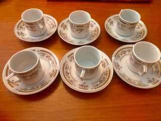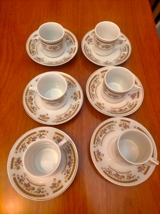 Precioso juego de seis tazas de porcelana con detalles dorados. Ideales para el café o el té. Se encuentran en perfecto estado. - Seis tazas con platillos a juego. - Diseño elegante y delicado. - Decoración con escenas campestres.