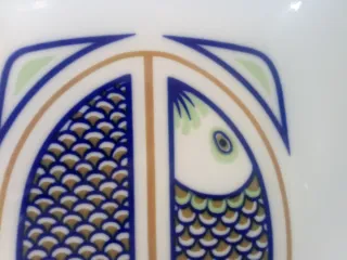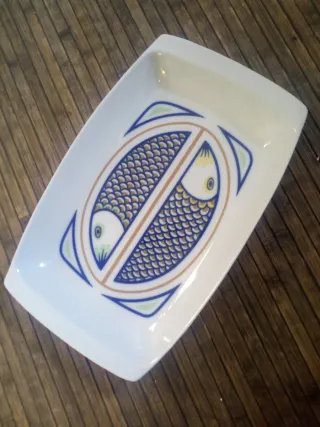 Bandeja besuguera de porcelana con un diseño de peces. Prácticamente nueva excepto por un minúsculo cosque en el borde que no se nota a primera vista. - Diseño rectangular curvo con dos peces. - Colores azul, blanco y detalles en ocre, verde y amarillo. - Sirve tanto para servir como para horno. Esta marca es "de coleccionista" porque ya no se fabrican. Para servir el besugo de Navidad con la elegancia que merece.