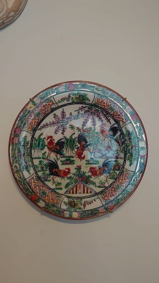 Preciosos platos de porcelana para colgar, pintados a mano con escenas de gallos y flores. Ideales para decorar cualquier espacio con un toque oriental. - Dos platos de porcelana. - Diseño multicolor con gallos y flores. - Perfecto estado de conservación.