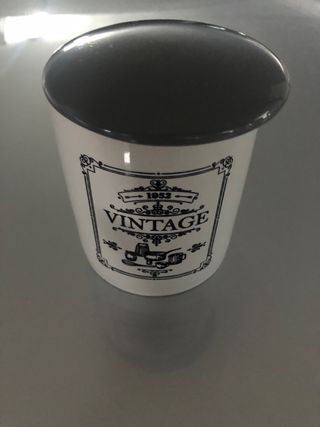 El de porcelana y color blanco con inscripción de la palabra en tonos grises “Vintage” y la tapadera es de color gris claro Medidas de alto 10 cm y de diámetro de base unos 8 cm. como un vaso normal