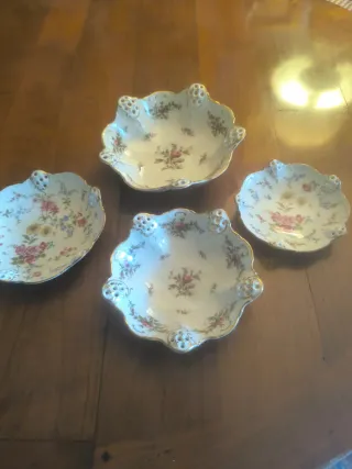 Precioso juego de cuatro cuencos de porcelana fina de la marca Rosenthal. Cada pieza está delicadamente decorada con un diseño floral en tonos pastel y un borde dorado. - Diseño floral multicolor. - Borde con detalle dorado. - Piezas con forma festoneada y calada, y con medidas : 1 cuenco grande de 23 cm diámetro y 7 de alto 2 cuencos medianos de 20 cm diámetro y 5 de alto 1 cuenco pequeño de 16 cm diámetro y 4 alto Todos en perfecto estado, prácticamente sin uso Las fotos forman parte de la descripción del producto NO NEGOCIABLE