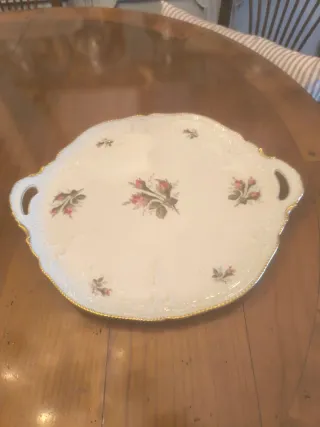 Elegante plato de porcelana de la marca Rosenthal, con un delicado diseño de rosas y detalles en oro. - Borde festoneado con acabado dorado. - Motivos florales pintados a mano. - Asas laterales para facilitar su manejo. - Rosenthal Sanssouci, de una belleza y calidad especial Medidas 36x31