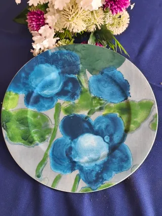 Elegante plato de porcelana con un delicado diseño floral. - Borde con detalles dorados. - Motivos de flores rosas y azules. - Acabado brillante. 1 Fuente 33 diámetro 5 platos llanos 19,5