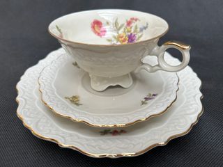 Elegante juego de taza y platillos de porcelana fina. Estado impecable, sin uso , objeto de vitrina. Ideal como un regalo.🎁 - Diseño floral pintado a mano. - Borde y detalles en oro. - Estilo Limoges.